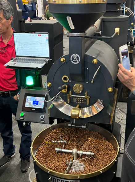 As we entered the fair, the first thing that caught our attention were the impressive stands of two major Colombian insurance companies: Seguros Sura and Seguros Bolívar. We were surprised to see their presence, but it made sense once we realized the crucial role insurance plays in the coffee export chain. The next stand we visited was Ingesec, a company specializing in agricultural machinery. In the center of their exhibit stood an impressive giant drum roaster, capable of roasting up to 12 kg of green coffee per batch. We witnessed a roasting demonstration while enjoying the delicious aroma of coffee beans toasting.